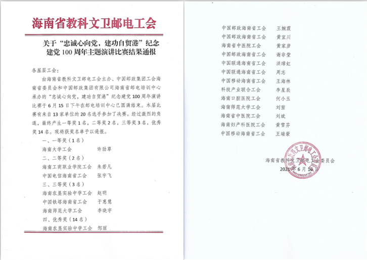 本網(wǎng)訊(通訊員?田恬安)2021年6月15日下午,由海南省教科文衛(wèi)郵電工會(huì)舉辦的“忠誠(chéng)心向黨,建功自貿(mào)港”紀(jì)念建黨100周年主題演講比賽決賽落下帷幕,我校工會(huì)選送的職工代表朱若凡老師以《一顆心向黨,奉獻(xiàn)自貿(mào)港》為題,聲情并茂地講述了一名樸實(shí)的人民教師在平凡的工作崗位無(wú)私奉獻(xiàn)的感人事跡,表達(dá)對(duì)祖國(guó)的熱愛(ài)和對(duì)黨的無(wú)限忠誠(chéng)。最終朱若凡老師獲得了總分第二名的優(yōu)異成績(jī)。