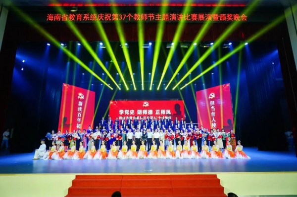 9月9日晚,“學(xué)黨史 明師德 正師風(fēng)”海南省教育系統(tǒng)慶祝第37個教師節(jié)主題演講比賽展演暨頒獎晚會在海南中學(xué)順利落幕。省人民政府副秘書長賴泳文,省教育廳黨委書記、廳長曹獻(xiàn)坤,省委機構(gòu)編制委員會辦公室一級巡視員殷永靜,省人力資源和社會保障廳二級巡視員羅海波,省教育廳派駐紀(jì)檢組組長周靈均,省教育廳副廳長李燕儀,省發(fā)展和改革委員會社會發(fā)展處副處長陳林敏等領(lǐng)導(dǎo)出席觀看。