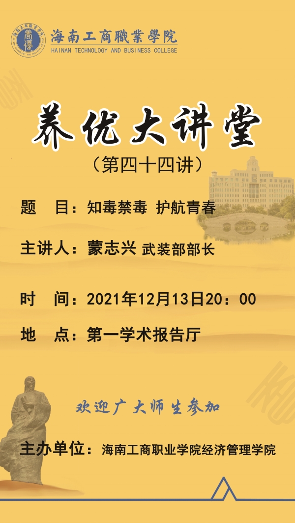 第四十四講“養(yǎng)優(yōu)大講堂”將于2021年12月13日晚上20:00在第一學術(shù)報告廳隆重開講!