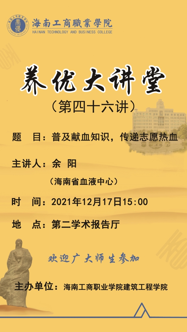 四十六講“養(yǎng)優(yōu)大講堂”將于2021年12月17日下午15:00在第二學(xué)術(shù)報告廳隆重開講!