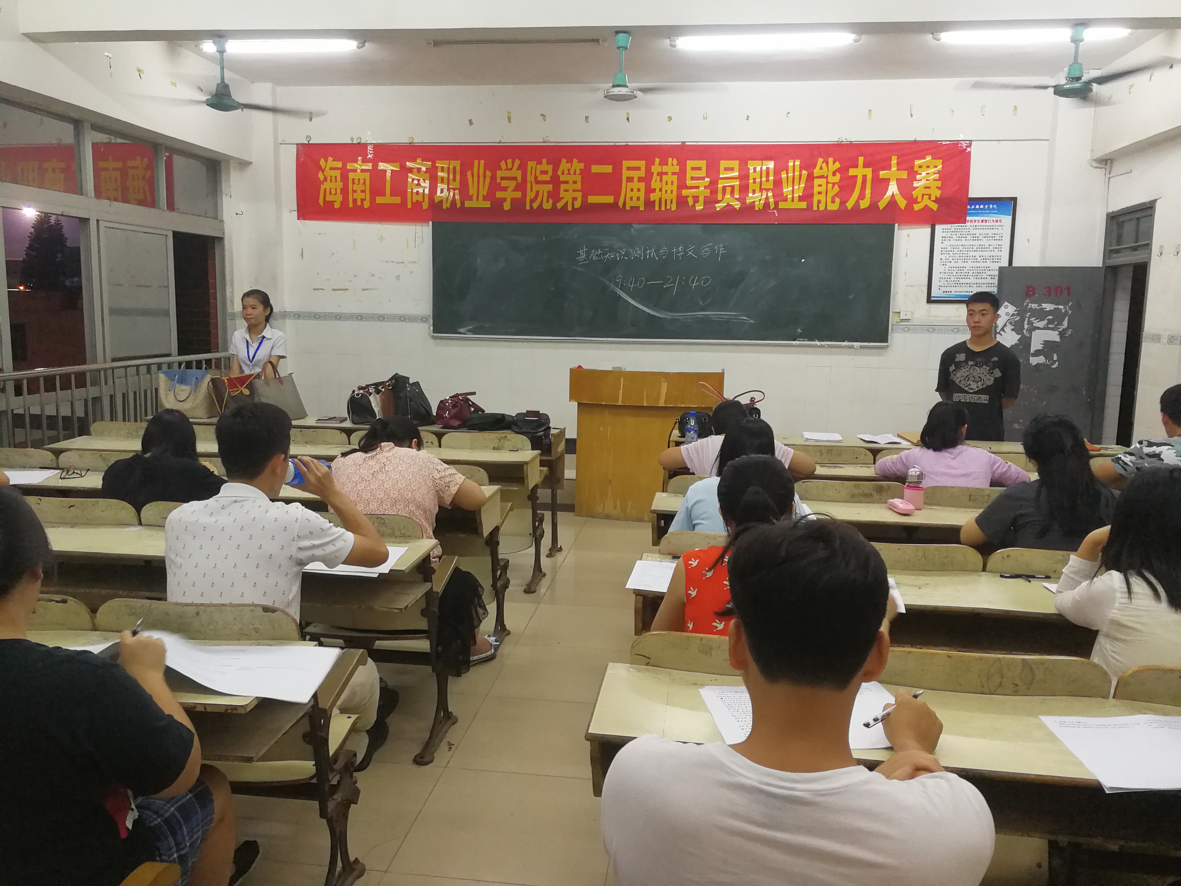 為進一步加強輔導員隊伍的職業化、專業化建設,切實提升我校輔導員在開展思想政治教育工作的職業能力、工作水平,本著以賽促學、以賽代訓的目的,根據《海南工商職業學院關于舉辦第二屆輔導員職業能力比賽的通知》(海工商學[2017]3號文件)安排,5月17日晚,我校2017年輔導員職業能力大賽之基礎知識與博文寫作比賽在教一301教室如期進行,共有23名輔導員參賽。