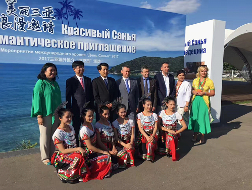 我校舞蹈專業(yè)學子與駐俄羅斯大使李輝先生、駐中國公使老季先生和三亞市市長吳巖峻等領導合影