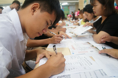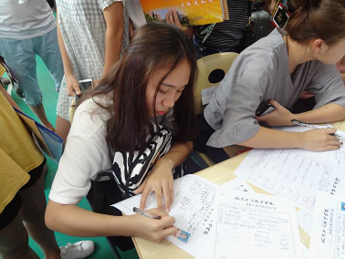 ??? 學(xué)子們陸陸續(xù)續(xù)地到來(lái),校園內(nèi)人來(lái)人往,志愿者連忙接過(guò)學(xué)子手中的行囊,頂著烈日的暴曬,臉上的汗珠在不停地滑落,但邁出的腳步卻沒(méi)有因此停下,志愿者還是很窩心地引領(lǐng)學(xué)子們到達(dá)目的地。一路上的互動(dòng),歡聲笑語(yǔ)都帶走了志愿者和學(xué)子們身上的勞累,留下的只有郎朗的歡笑聲。