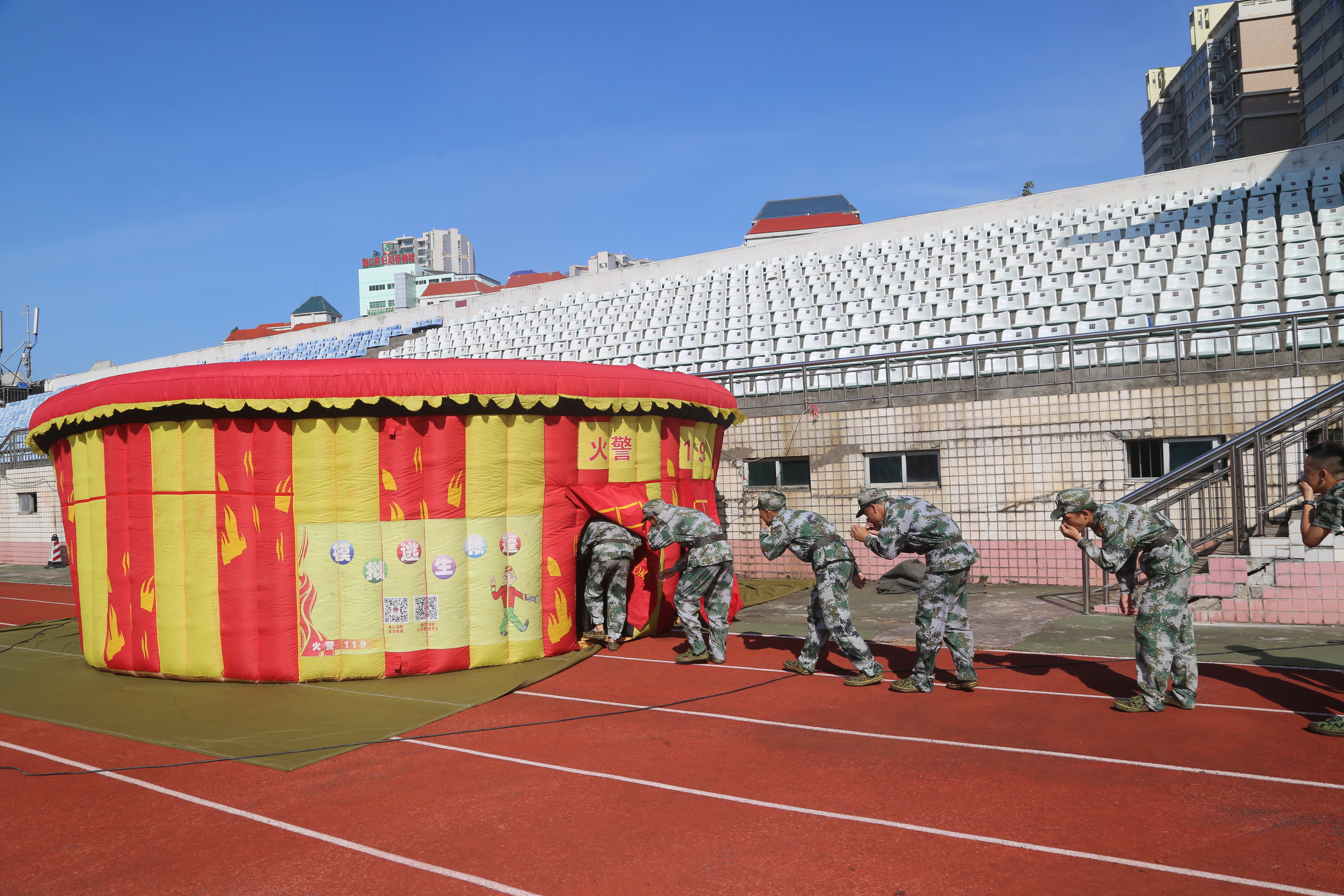 下午3點(diǎn),我校邀請海口消防支隊(duì)瓊山大隊(duì)的消防官兵為2017級學(xué)生支起一頂模擬逃生的帳篷。帳篷只有進(jìn)出兩個(gè)門口,里面漆黑一片。學(xué)生需要在沒有照明、濃煙密布的情況下“逃”出火災(zāi)現(xiàn)場。通過模擬火災(zāi)逃生帳篷的演練,學(xué)生們不僅再次演練了用濕毛巾捂上口鼻,低下身體逃離火場的技能,還體驗(yàn)到了著火時(shí)自身慌亂的情緒。這種身臨其境的演練讓學(xué)生印象深刻。