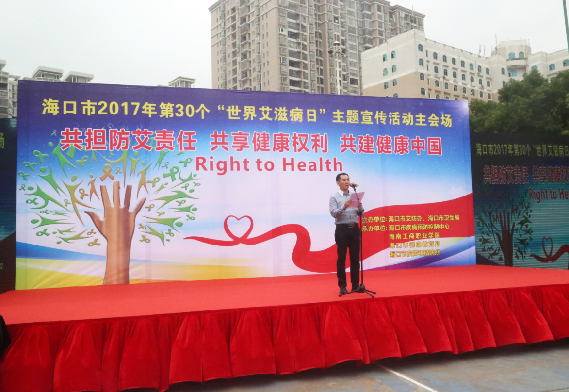 我校黨委書記黃恒在開幕式中致辭,他強(qiáng)調(diào)高校艾滋病防治知識宣傳教育工作依舊任重道遠(yuǎn)。希望能夠以此次活動為契機(jī),將高校大學(xué)生健康教育以及艾滋病宣傳工作常態(tài)化,不斷提高大學(xué)生健康防護(hù)意識,提升艾滋病防控知識認(rèn)知水平。接著海口市高校學(xué)生代表以演講的形式向全市大學(xué)生發(fā)出了“攜手抗艾,你我同行”的倡議。會上對近期全市艾防“知識競賽”、“演講比賽”獲獎?wù)哌M(jìn)行了通報表彰,并由在場領(lǐng)導(dǎo)們?yōu)楂@獎?wù)哳C發(fā)榮譽(yù)證書。最后,鄧海華副市長發(fā)表重要講話,他呼吁要實現(xiàn)中華民族的偉大復(fù)興,需要我們每一個人都要作出貢獻(xiàn),艾滋病防控不光是衛(wèi)生部門的事,大學(xué)生也要積極行動起來,為防艾做出貢獻(xiàn)。