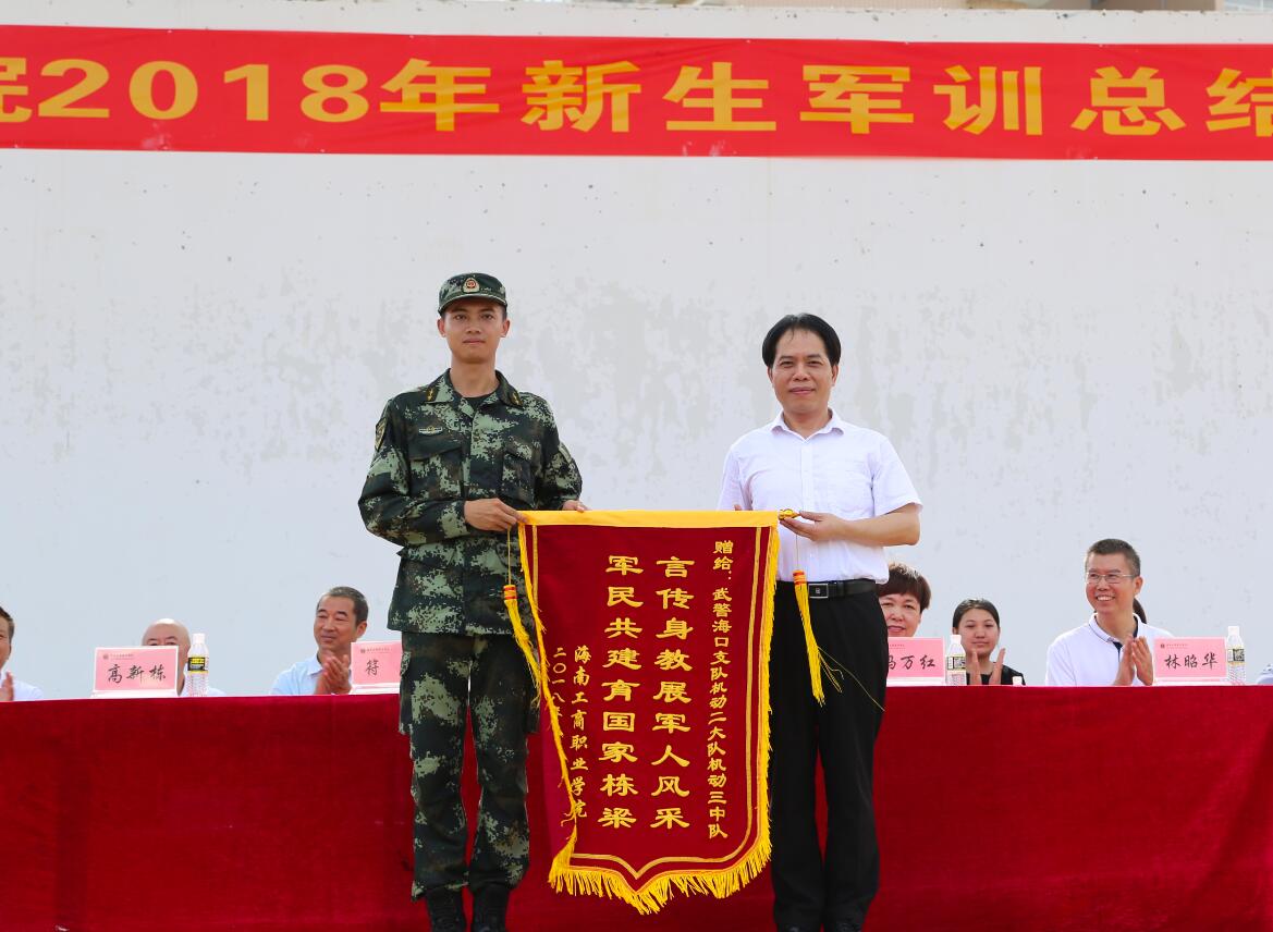 符勇校長向承訓部隊武警海口支隊贈送錦旗。