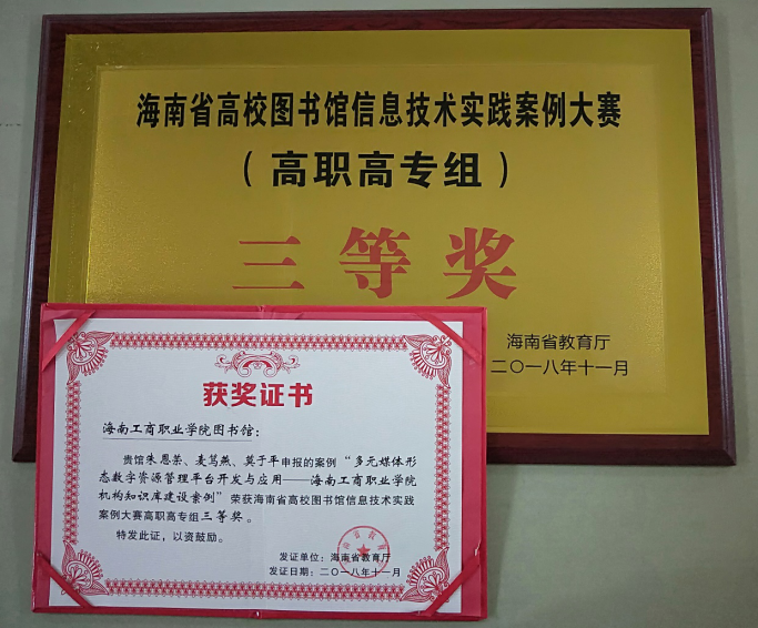 在這次會(huì)議上,省教育廳和省高校圖工委公布了?“2018年海南省高校圖書館信息技術(shù)實(shí)踐案例大賽”的結(jié)果并頒獎(jiǎng)。我校圖書館的參賽項(xiàng)目“多元媒體形態(tài)數(shù)字資源管理平臺(tái)開發(fā)與應(yīng)用——海南工商職業(yè)學(xué)院機(jī)構(gòu)知識(shí)庫建設(shè)案例”?經(jīng)過現(xiàn)場(chǎng)匯報(bào)和答辯,最終榮獲海南省高校圖書館信息技術(shù)實(shí)踐案例大賽(高職高專組)第三名。