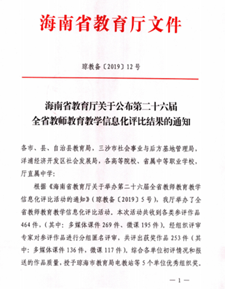 (本網訊 通訊員 陳雅雯)為提高教師信息技術應用能力,推進教育教學信息化工作,海南省教育廳舉辦了第二十六屆全省教育教學信息化評比活動。根據海南省教育廳的統(tǒng)一部署,我校積極組織開展了教師教學信息化課件評比與選拔活動,經校學術委員會評審,共選出五件作品推薦參加了本屆教育教學信息化評比。
