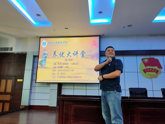 本網(wǎng)訊 (通訊員 倪小鳳)12月15日上午,“養(yǎng)優(yōu)大講堂”第十四講在我校第一學(xué)術(shù)報告廳舉辦。本次大講堂以“大學(xué)生職業(yè)生涯規(guī)劃——自我認(rèn)知”為主題,我校團委特邀我校學(xué)生處處長寶曉鵬老師擔(dān)任主講,全校師生共200余人參加。