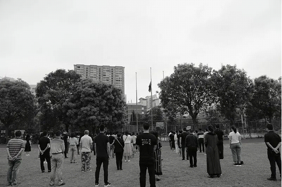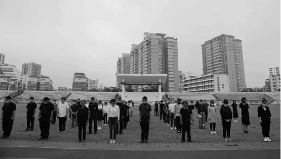 教師們?cè)谶\(yùn)動(dòng)場(chǎng)集中默哀,深切悼念英烈