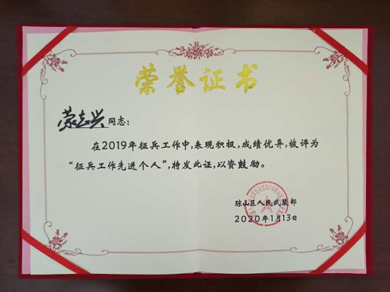 本網(wǎng)訊 (通訊員 蒙志興)4月7日上午,海口市瓊山區(qū)2020年武裝工作會議在區(qū)人民政府舉行,區(qū)委書記陳昊旻、區(qū)長王和嬌在會上分別對“2019年度征兵工作先進(jìn)單位”和先進(jìn)個人進(jìn)行了表彰。我校征兵工作在各鄉(xiāng)鎮(zhèn)、街道、各企事業(yè)單位和高校武裝部中表現(xiàn)突出,在輸送兵源數(shù)量和質(zhì)量上名列前茅,是全區(qū)5所高校中唯一獲得 “2019年度征兵工作先進(jìn)單位”榮譽(yù)稱號殊榮的學(xué)校,同時,我校武裝部部長蒙志興同志榮獲征兵工作先進(jìn)個人稱號。