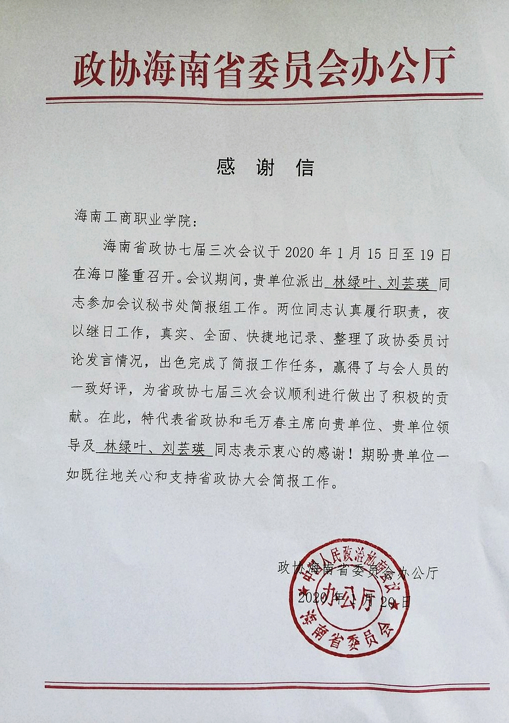 ???政協(xié)海南省委員會辦公廳給我校林綠葉、劉蕓瑛兩位老師發(fā)來感謝信,感謝她們在海南省政協(xié)七屆三次會議期間,認真履行職責,出色完成簡報工作任務(wù)。