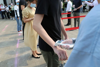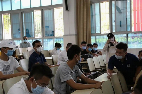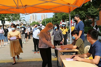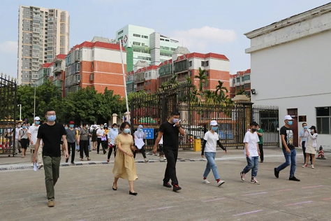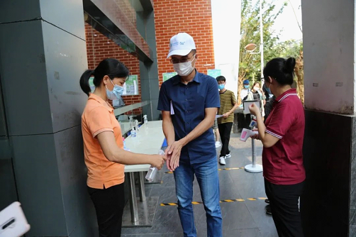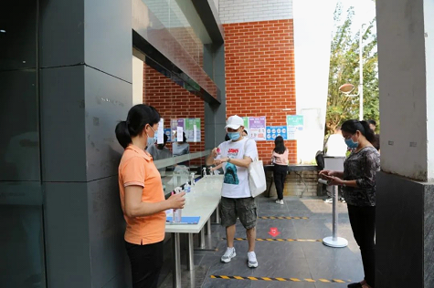 學(xué)校大門設(shè)有六條入校通道,“學(xué)生”保持1.5米間隔距離,有序入校,消毒防疫組為入校學(xué)生進(jìn)行測(cè)溫消毒,“學(xué)生”行至二級(jí)學(xué)院報(bào)到處提交學(xué)生承諾書、家長(zhǎng)承諾書后,進(jìn)入教學(xué)生活區(qū)。