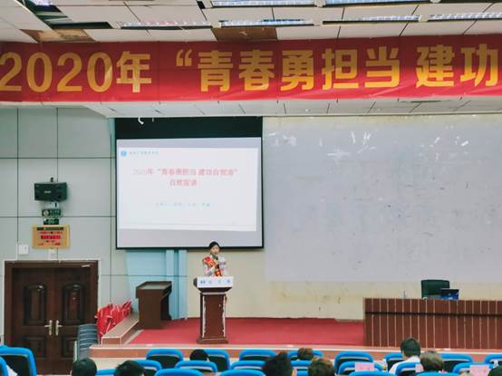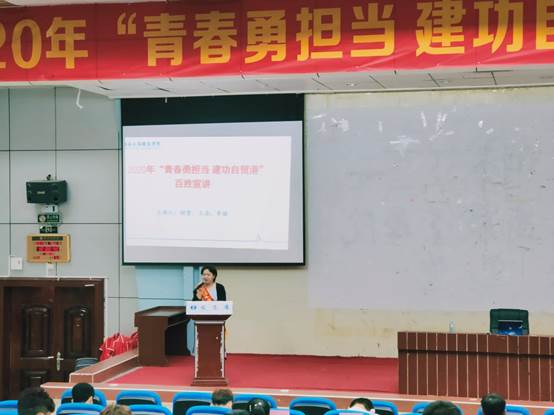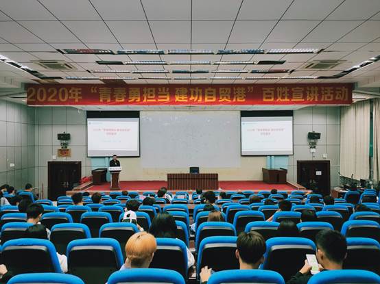 本網(wǎng)訊 (通訊員 倪小鳳)10月28日下午,由共青團(tuán)海南省委員會(huì)主辦,共青團(tuán)海南工商職業(yè)學(xué)院委員會(huì)承辦的2020年“青春勇?lián)?dāng)? 建功自貿(mào)港”百姓宣講活動(dòng)在我校第二報(bào)告廳舉行,團(tuán)省委宣傳與網(wǎng)絡(luò)工作部符詩(shī)夢(mèng)帶領(lǐng)由中共海南省委全面深化改革委員會(huì)辦公室二級(jí)主任科員、機(jī)關(guān)團(tuán)委委員程雪,共青團(tuán)三沙市委志愿者王浩,海南省中醫(yī)院內(nèi)分泌科副護(hù)士長(zhǎng)、主管護(hù)師李麗組成的宣講團(tuán)走進(jìn)海工商。校團(tuán)委全體人員、2020年入團(tuán)積極分子共100余人到會(huì)聆聽(tīng)。