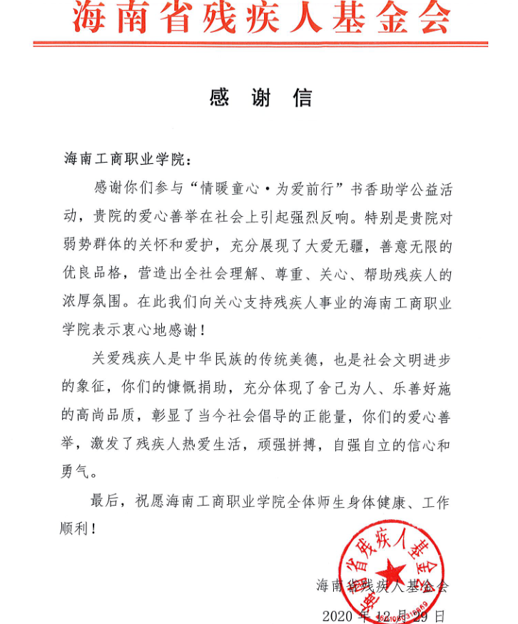 ????海南省殘疾人基金會給我校發(fā)來感謝信,感謝學(xué)校積極參與“情暖童心·為愛前行”書香助學(xué)公益活動,為弱勢群體貢獻(xiàn)一份關(guān)心與愛護(hù)。