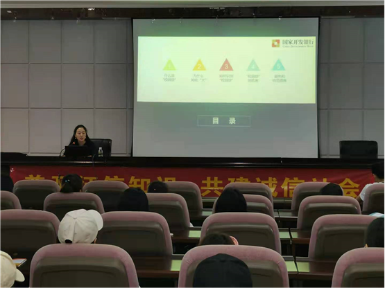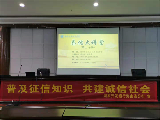 本網(wǎng)訊(通訊員?宋金易慧)4月23日下午,“養(yǎng)優(yōu)大講堂”第二十講在學(xué)校圖書館報告廳舉辦。本次大講堂以“國家助學(xué)成長 遠(yuǎn)離非法貸款”為主題,國家開發(fā)銀行海南省分行客戶經(jīng)理唐小淇和謝華榮擔(dān)任主講,全校師生代表共100余人參加。
