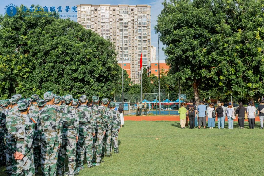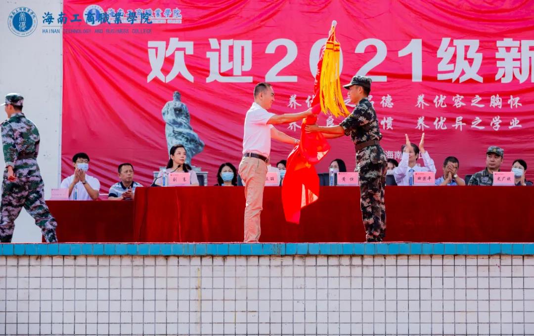 ????會上,2021級新生劉虹辰同學(xué)、教師代表王晶晶、教官代表張慶亮分別上臺發(fā)言。黨委書記黃恒代表學(xué)校為軍訓(xùn)團(tuán)授旗,預(yù)祝2021級新生順利完成軍訓(xùn)任務(wù)。