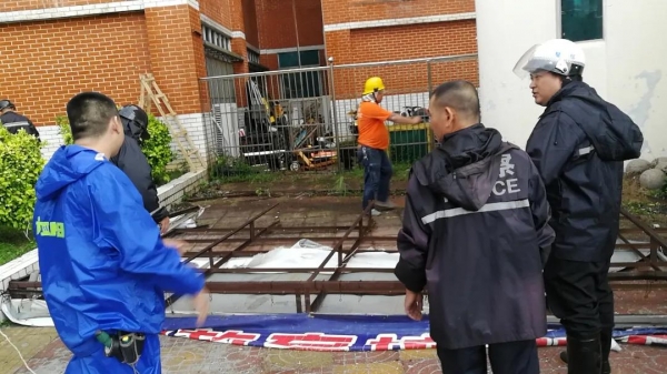 臺風登陸前,后勤處、保衛(wèi)處、學生處、各學院在崗在位,組成應急搶險小分隊,集中待命,應對突發(fā)情況,及時處置險情,不畏風雨,全力確保師生生命財產(chǎn)安全。