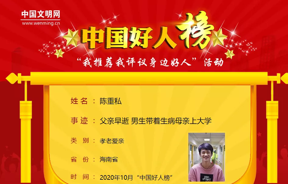 在幼年時(shí),陳重私的父親因病去世,母親不幸因病雙腿殘疾。從十一歲起,照顧媽媽和弟弟,成了陳重私肩上的責(zé)任。2018年,為了照顧母親,陳重私毅然放棄省外求學(xué)的理想,選擇留在海南讀書,并決定帶著母親上大學(xué)。他一邊悉心照料病中的母親和年幼的弟弟,一邊加倍勤奮努力學(xué)習(xí),克服同齡人難以想象的重重困難,以實(shí)際行動闡釋著孝老愛親的內(nèi)涵,在平凡的生活中為家人默默奉獻(xiàn),用愛心溫暖家人,用孝心撐起一個(gè)家。