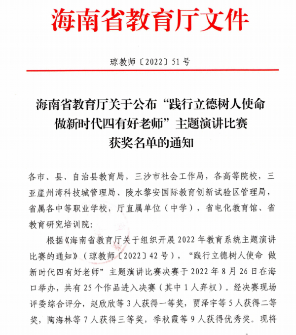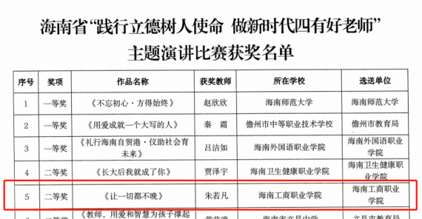 ?本網(wǎng)訊(通訊員?高?暢)近日,根據(jù)海南省教育廳印發(fā)的《關(guān)于公布“踐行立德樹人使命 做新時(shí)代四有好老師”主題演講比賽獲獎名單的通知》,經(jīng)我校人事處組織推選,我校朱若凡老師演講作品《讓一切都不晚》榮獲“踐行立德樹人使命 做新時(shí)代四有好老師”主題演講比賽二等獎的好成績。