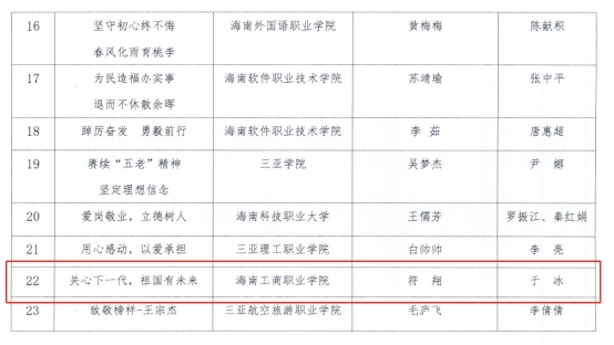 本網(wǎng)訊(通訊員 高 暢)近日,海南省教育廳關(guān)工委對2022年海南省高校“讀懂中國”活動評審結(jié)果發(fā)布通報,我校推薦的2個作品獲獎。其中,由韓偉、劉蕓瑛兩位老師指導(dǎo),譚青蝶同學(xué)微視頻作品《追光者》榮獲“最佳微視頻”;由于冰老師指導(dǎo),符翔同學(xué)征文作品《關(guān)心下一代,祖國有未來》,榮獲“優(yōu)秀征文”獎。