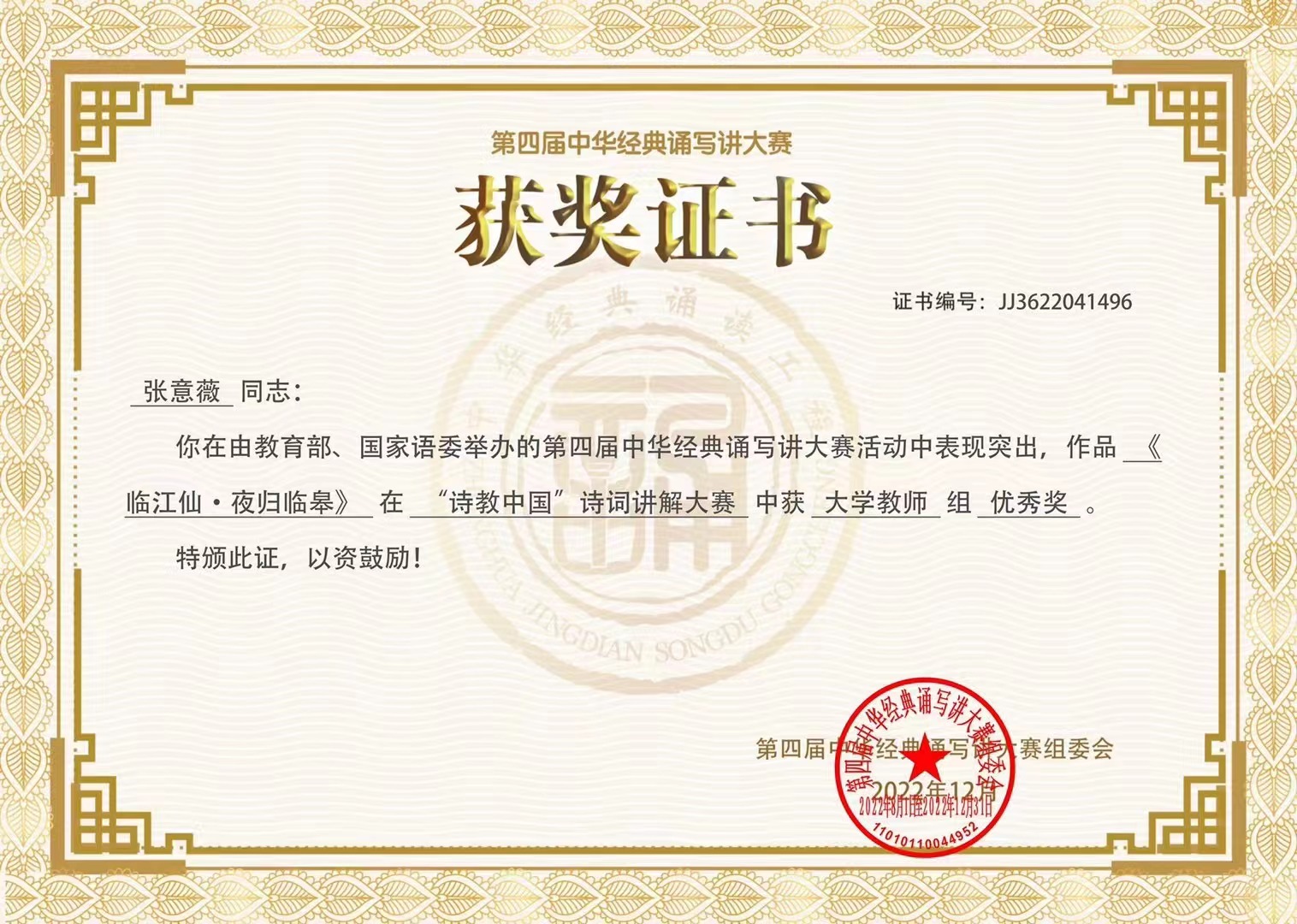 本網(wǎng)訊(通訊員 武 劼)近期,我校思政課部教師張意薇的作品《臨江仙·夜歸臨皋》在第四屆中華經(jīng)典誦寫(xiě)講大賽“迦陵杯?詩(shī)教中國(guó)”詩(shī)詞講解大賽中喜獲優(yōu)秀獎(jiǎng)。