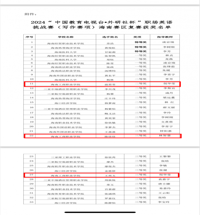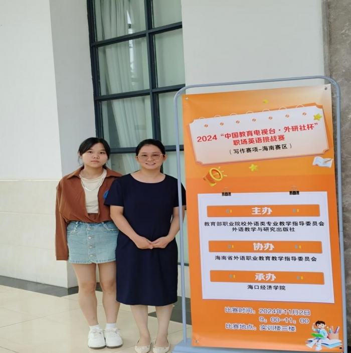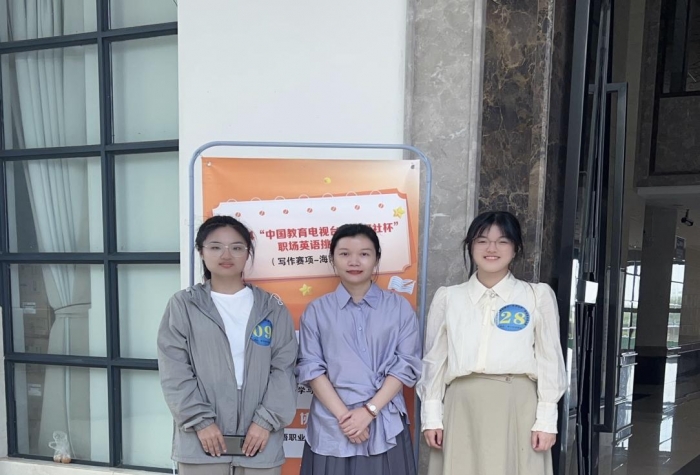 ?本網(wǎng)訊(通訊員 倪華瑩)11月2日,由中國教育電視臺、外語教學(xué)與研究出版社、海南省外語職業(yè)教育教學(xué)指導(dǎo)委員會(huì)主辦的2024年“中國教育電視臺?外研社杯”職場英語挑戰(zhàn)賽(寫作賽項(xiàng))”海南賽區(qū)決賽在海口圓滿落幕。我校2023級醫(yī)學(xué)檢驗(yàn)技術(shù)專業(yè)學(xué)生溫思瑩、王奕文(指導(dǎo)教師公共課教學(xué)部倪華瑩)分別獲二等獎(jiǎng)、三等獎(jiǎng);2023級電子商務(wù)專業(yè)學(xué)生陳佳佳(指導(dǎo)老師公共課教學(xué)部林智慧)獲三等獎(jiǎng)。