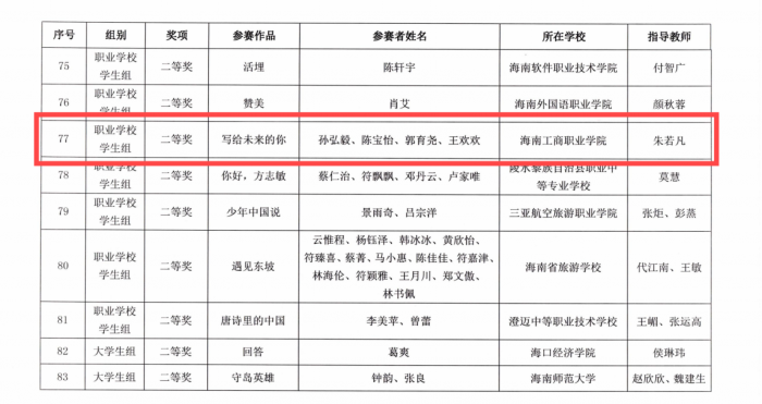 ?本網(wǎng)訊(通訊員 高 暢)近期,我校師生在第六屆中華經(jīng)典誦寫講大賽海南賽區(qū)“誦讀中國”經(jīng)典誦讀大賽喜獲佳績。我校參賽隊(duì)伍衛(wèi)生健康學(xué)院學(xué)生孫弘毅、郭育堯,信息工程學(xué)院學(xué)生陳寶怡、王歡歡,指導(dǎo)老師公共課教學(xué)部朱若凡的參賽作品《寫給未來的你》榮獲職業(yè)學(xué)校學(xué)生組二等獎(jiǎng)。