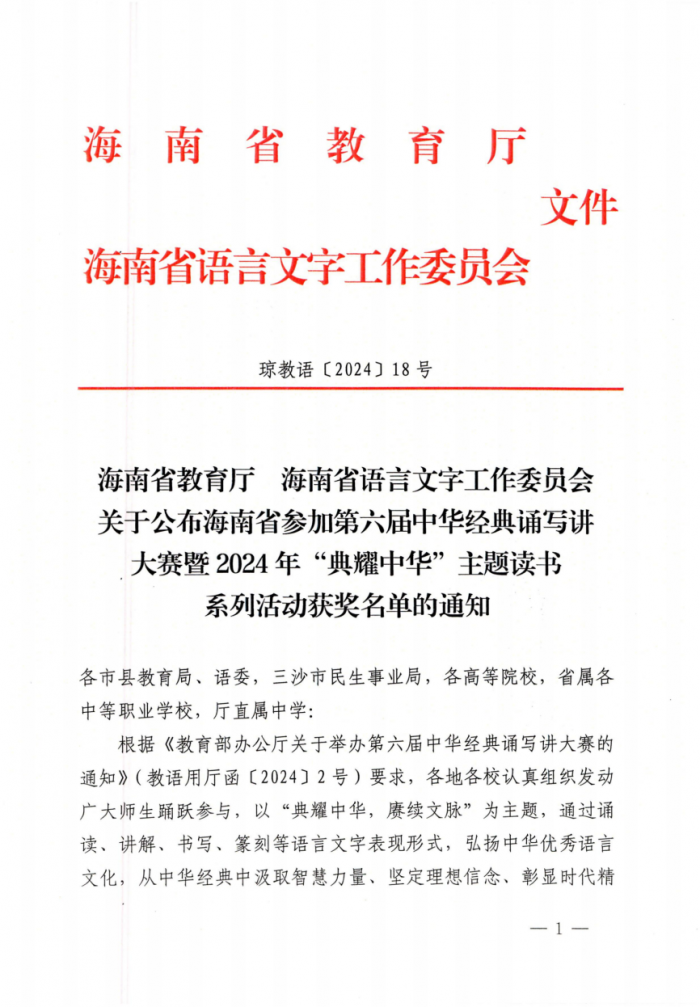 喜報(bào) 我校師生在第六屆中華經(jīng)典誦寫講大賽海南賽區(qū)“誦讀中國”經(jīng)典誦讀大賽榮獲二等獎(jiǎng)