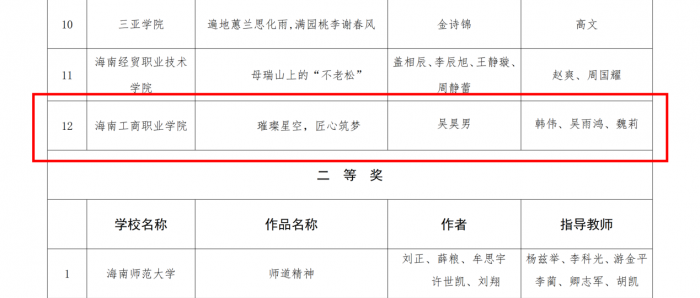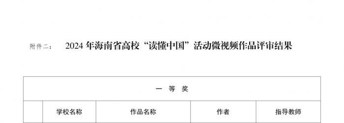 ?本網(wǎng)訊(通訊員 高 暢)近日,根據(jù)《海南省教育廳關(guān)工委關(guān)于2024年海南省高校“讀懂中國”活動作品評審結(jié)果的通知》(瓊教關(guān)〔2024〕13號)文件通知,我校旅游藝術(shù)學(xué)院吳昊男同學(xué)的微視頻作品《璀璨星空,匠心筑夢》(指導(dǎo)老師:旅游藝術(shù)學(xué)院黨支部書記韓偉、團(tuán)總支書記吳雨鴻,黨政辦副主任魏莉)獲海南省高校2024年“讀懂中國”活動微視頻一等獎!